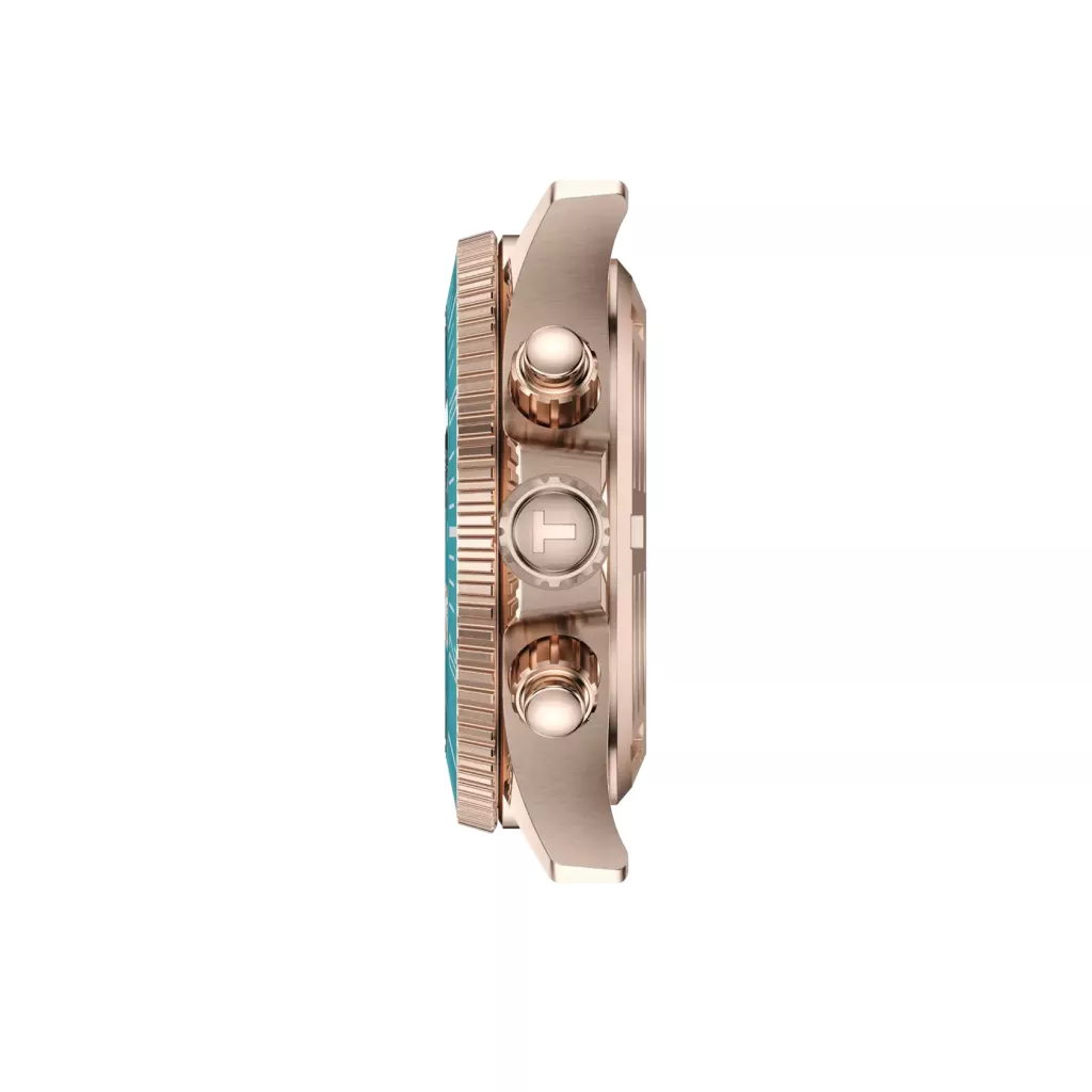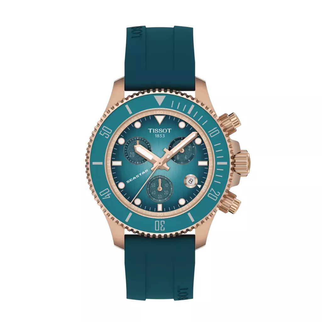 Годинник Tissot Seastar 1000 Quartz Chronograph 38mm T120.217.37.041.00 — це яскравий та функціональний дайверський хронограф, який поєднує в собі спортивний характер, високу водостійкість і стильний дизайн. Його компактний корпус діаметром 38 мм робить його універсальним аксесуаром, що підходить для різноманітних зап'ясть. Корпус виготовлений з високоякісної нержавіючої сталі 316L з PVD-покриттям кольору рожевого золота. Це покриття надає годиннику розкішного та сучасного вигляду, підвищуючи його стійкість до подряпин та зносу. Циферблат має градієнтний бірюзовий (turquoise) колір, який візуально нагадує морські глибини. На циферблаті розташовані три суб-циферблати хронографа (1/10 секунди, 60 секунд, 30 хвилин) та віконце дати на позначці "4 години". Оснащений односпрямованим обертовим безелем з бірюзовою мінеральною вставкою, що є важливим елементом для дайверів. Він дозволяє безпечно відстежувати час занурення. Годинник працює на надійному швейцарському кварцовому механізмі. Циферблат захищений стійким до подряпин сапфіровим склом з двостороннім антивідблисковим покриттям, що гарантує ідеальну прозорість та захист від пошкоджень. Ця модель має вражаючий рівень водостійкості 30 бар (300 метрів / 1000 футів). Завдяки загвинчуваній заводній головці та задній кришці годинник надійно захищений від води, що дозволяє використовувати його для плавання, сноркелінгу та занурень з аквалангом. Годинник комплектується зручним силіконовим ремінцем бірюзового кольору, який ідеально підходить для водних видів спорту. Ремінець оснащений стандартною пряжкою з PVD-покриттям кольору рожевого золота. Крім того, він має систему швидкої заміни (interchangeable quick release), що дозволяє легко замінити його без використання інструментів. Годинник Tissot Seastar 1000 Quartz Chronograph 38mm T120.217.37.041.00 — це чудовий вибір для тих, хто шукає надійний, високофункціональний і стильний годинник для активного відпочинку. Яскравий бірюзовий колір та елегантне покриття кольору рожевого золота роблять його помітним аксесуаром, а високий рівень водозахисту та швейцарський кварцовий механізм гарантують точність та довговічність. Це ідеальний годинник для пригод, що поєднує спортивний дух і витончений дизайн.