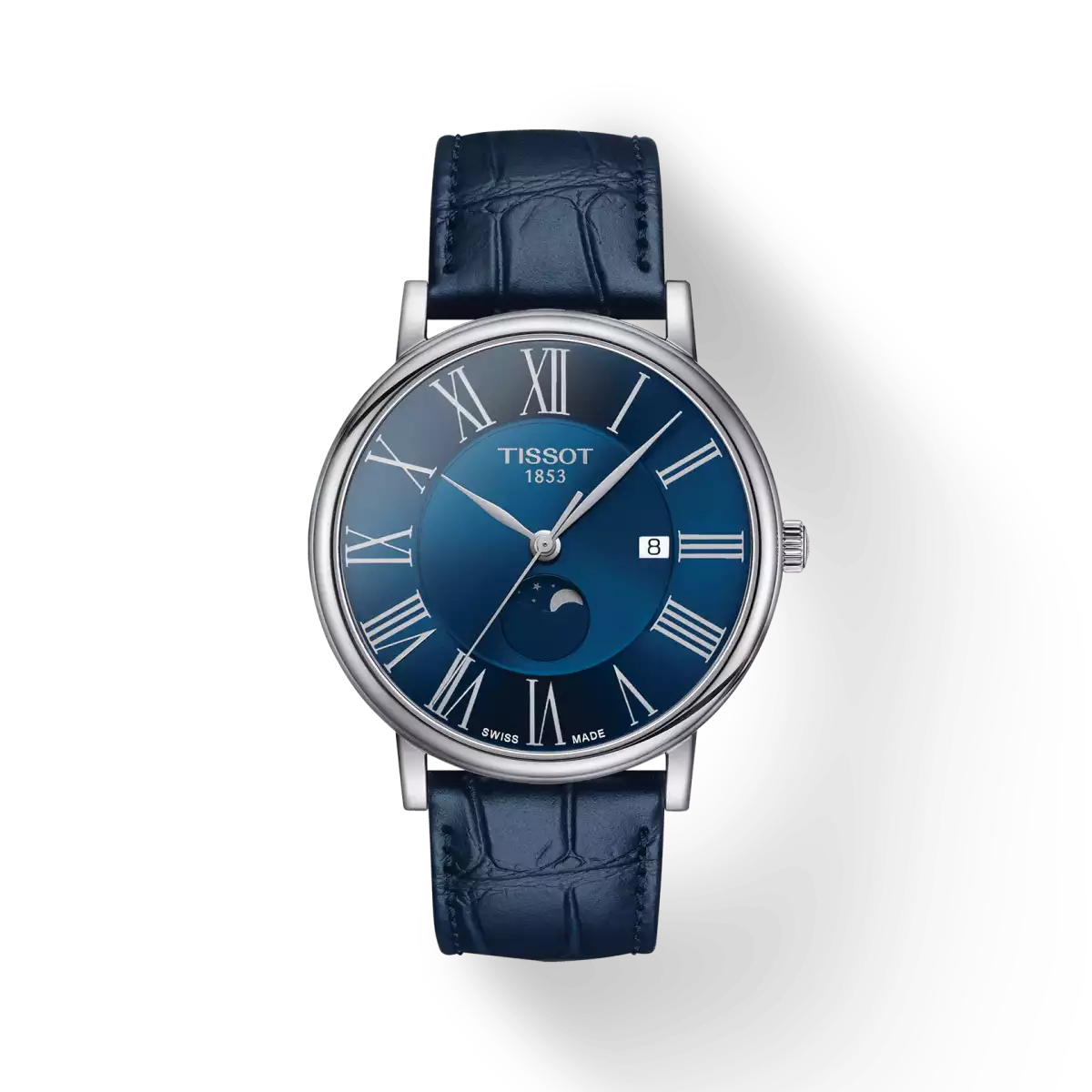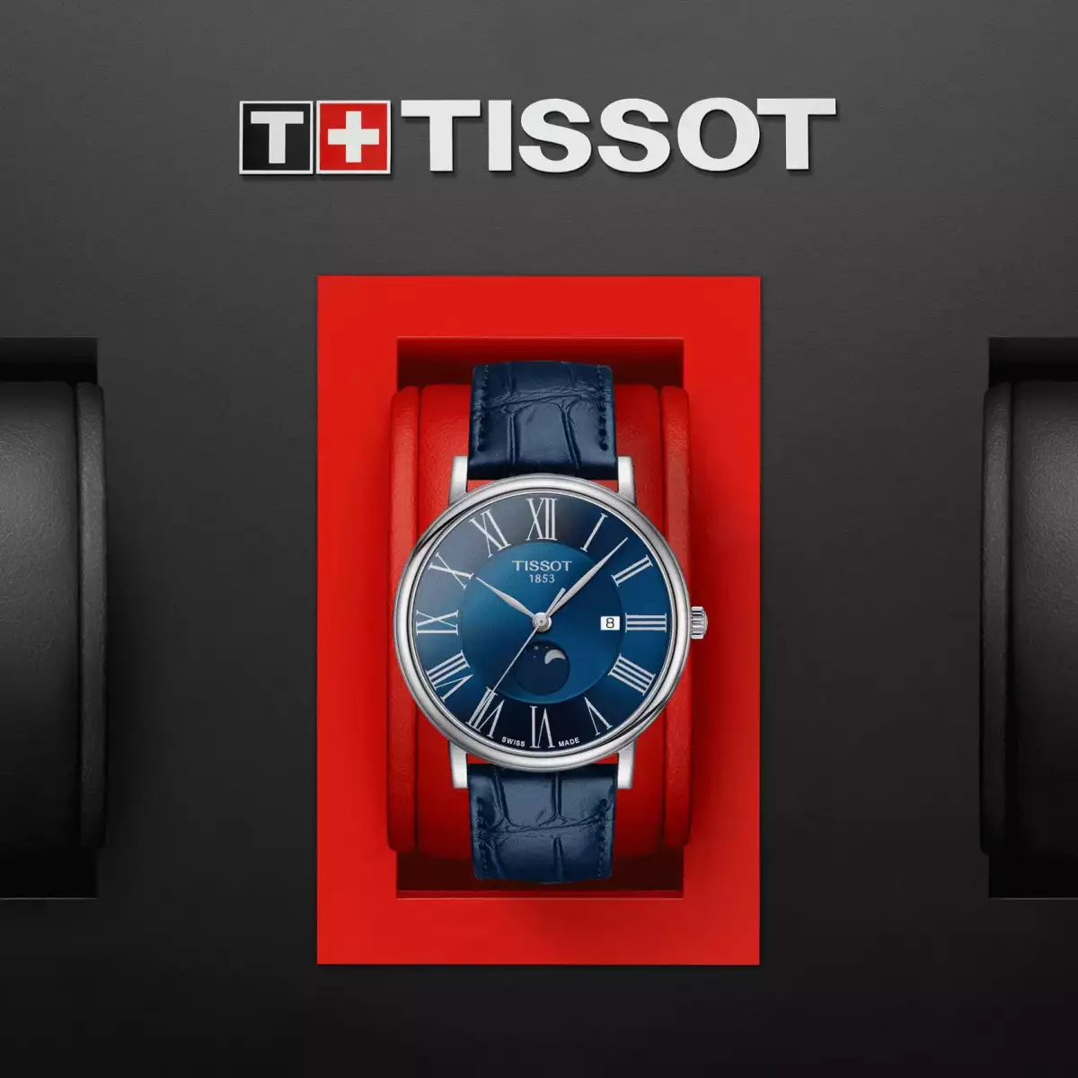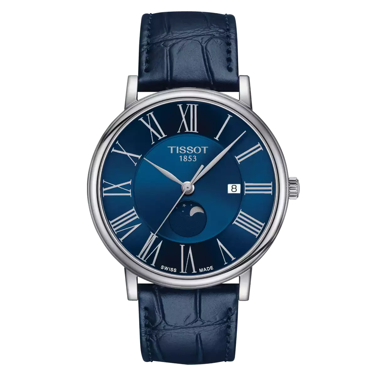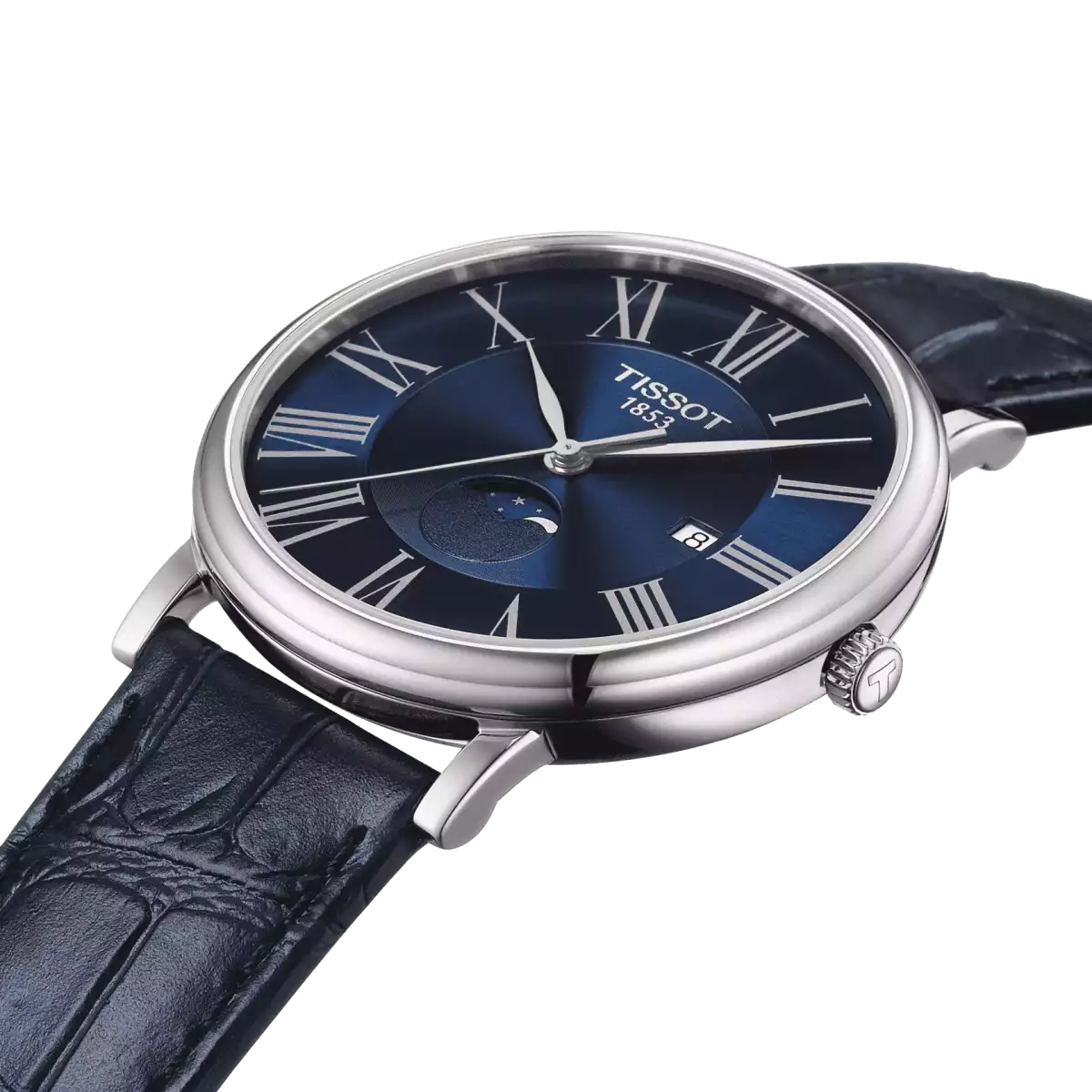 Чоловічий годинник Tissot примітний великим синім циферблатом із невеликим віконцем дати та римськими цифрами, в нижній частині якого відображаються фази Місяця. Оскільки ця модель кварцова, то в ній є функція індикації заряду батарейки.