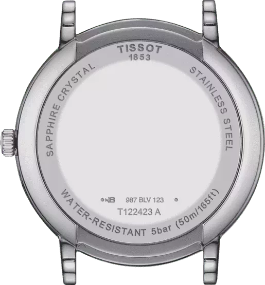 Годинник Tissot комплектується стійким до появи подряпин сапфіровим склом. Також він має рівень водонепроникності до 5 бар та оснащений функцією дати. Сталевий сріблястий корпус класичного швейцарського годинника Tissot гарно гармонує з темно-синім ремінцем із натуральної шкіри, що доповнений стандартною застібкою.