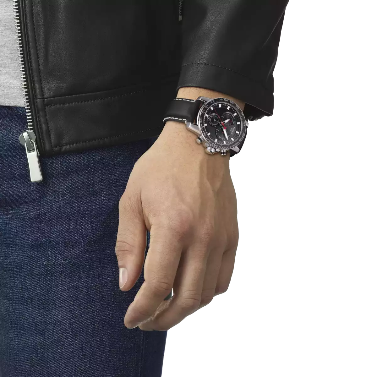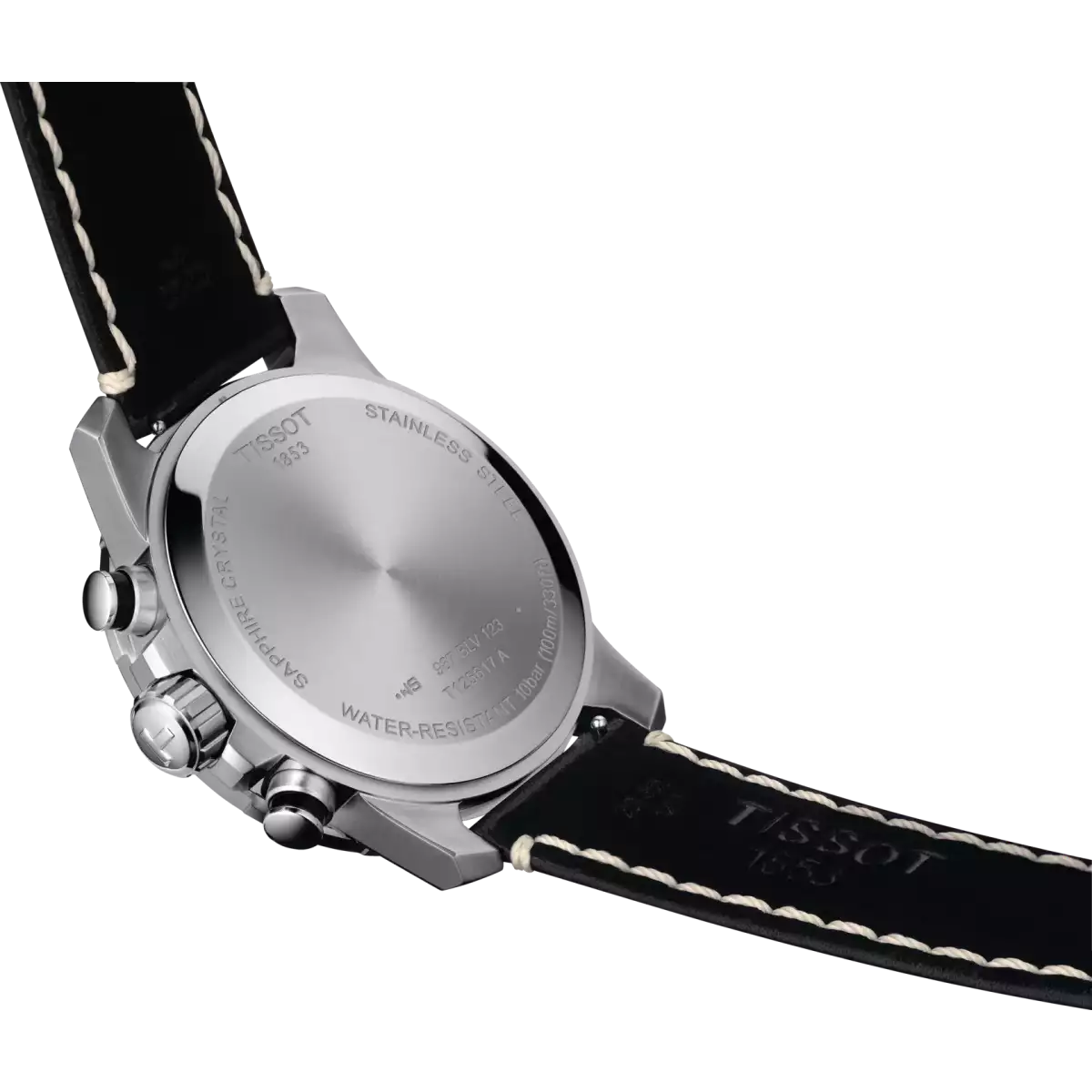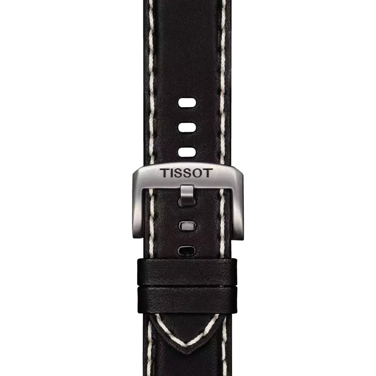 Гарний ремінець чорного кольору з натуральної шкіри з оригінальною білою строчкою та класичною застібкою відмінно доповнює спортивний дизайн швейцарського годинника Tissot.