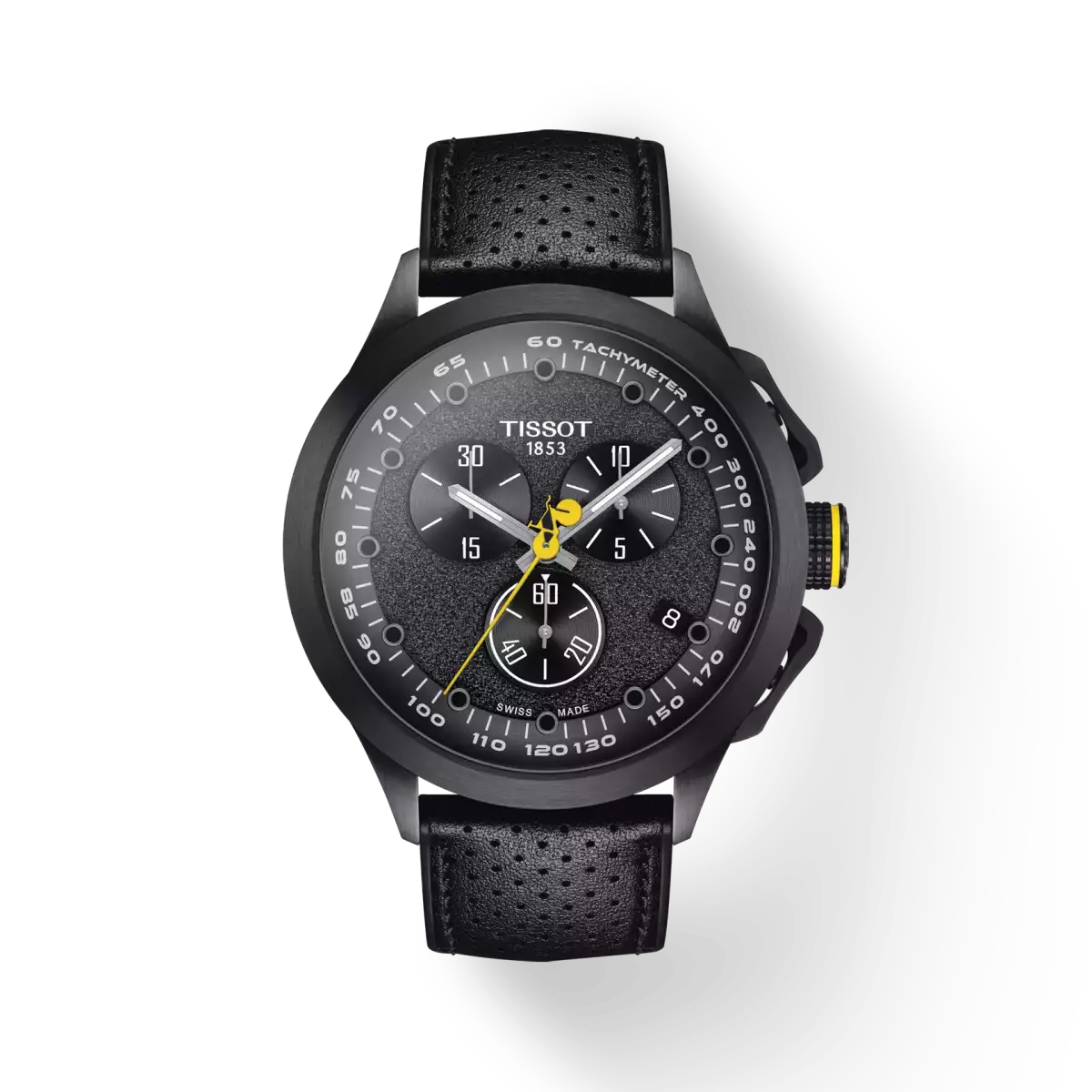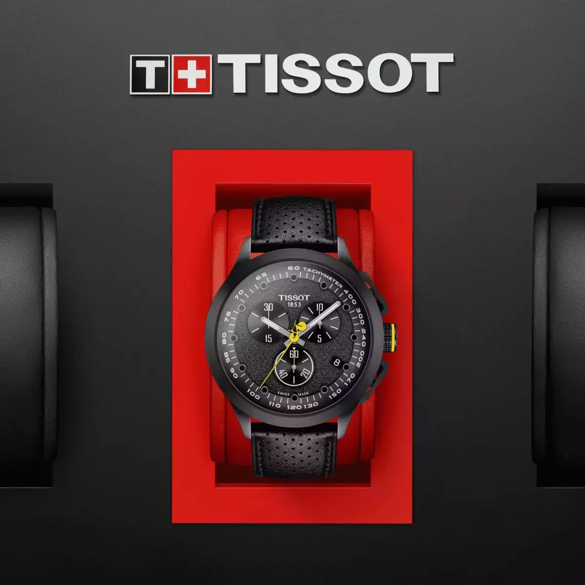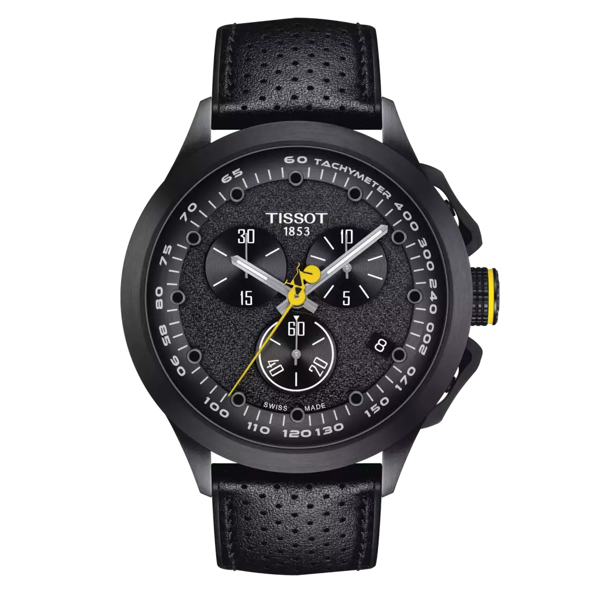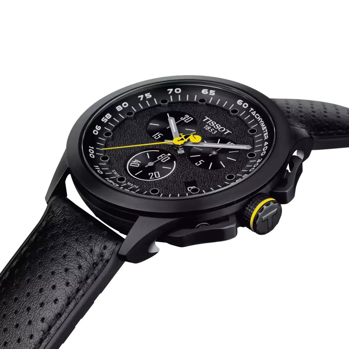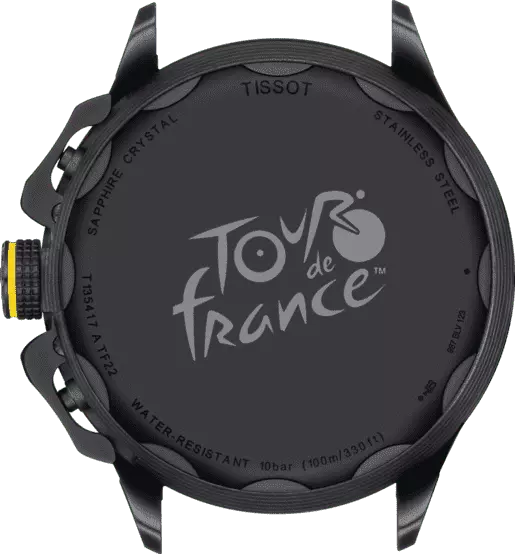 Ця модель швейцарського годинника Tissot присвячена Тур де Франс, про що свідчить гравіювання в вигляді логотипу на задній кришці корпусу та наявність знакових жовтих кольорів на заводній голівці та секундній стрілці.
