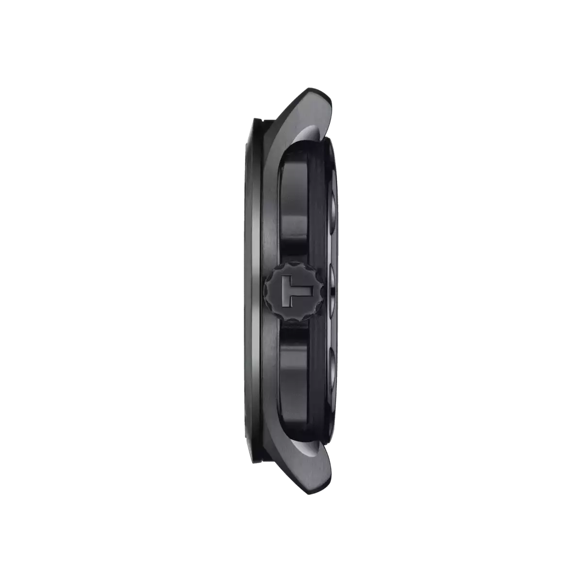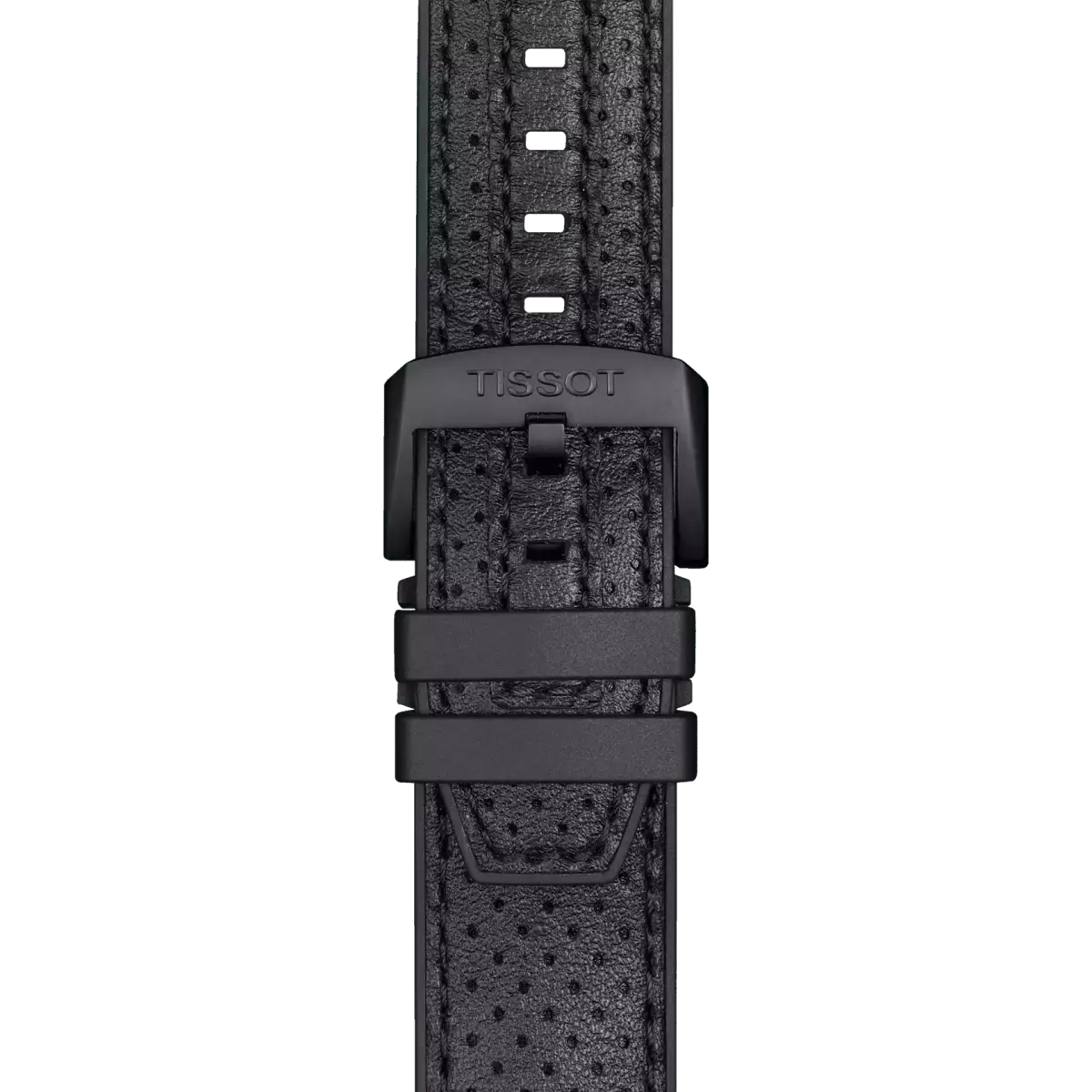 Сталевий корпус чоловічого годинника Tissot із ПВД напиленням чорного кольору доповнений ремінцем із натуральної шкіри в тон.