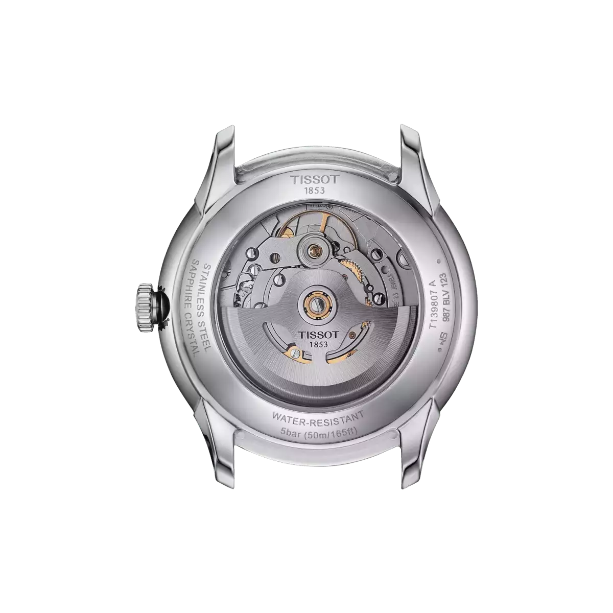 В круглому сталевому корпусі годинника Tissot міститься автоматичний механізм, а розглянути його можна завдяки такій деталі, як прозора задня кришка. Ця модель оснащена сапфіровим склом і має водонепроникність до 50 м.