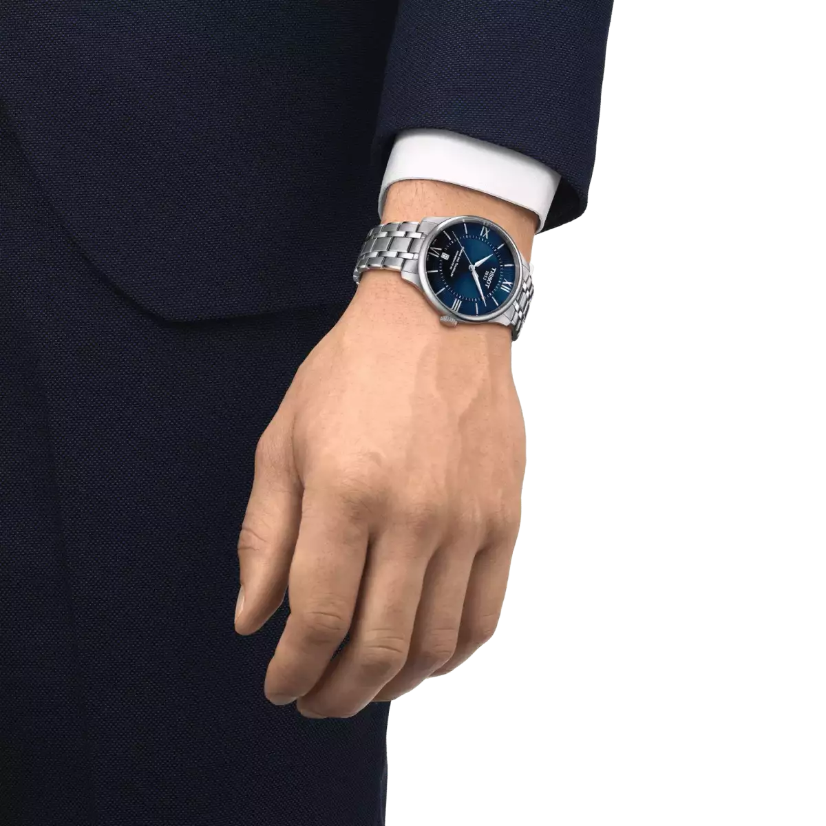 Механічний годинник Tissot з функцією автоматичного заводу відрізняє великий синій циферблат із римськими цифрами та індексами, а в спеціальному вікні відображається поточна дата.