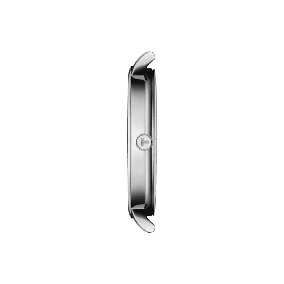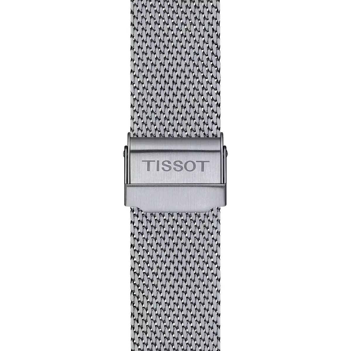 Сталевий корпус годинника Tissot має круглу форму та містить кварцовий механізм, а доповнює його розкішний сталевий браслет із міланським плетінням та ювелірною застібкою.
