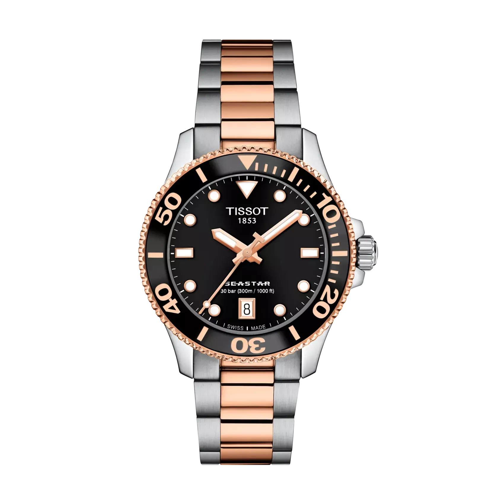 Швейцарський годинник Tissot Seastar 1000 Quartz 36mm T120.210.22.051.01 — елегантний і функціональний кварцовий годинник, що поєднує сучасний дизайн і високу продуктивність. Він ідеально підходить для повсякденного носіння та активного відпочинку. Корпус браслет з застібкою, що розкладається, і фіксатором виконані з нержавіючої сталі з PVD-покриттям кольору рожевого золота. Чорний циферблат з віконцем дати, люмінесцентними індексами та стрілками оснащений сапфіровим склом з покриттям антивідблиску. Дана модель з водонепроникністю до 30 бар оснащена заводною загвинчуючою заводною головкою і задньою кришкою. Спортивний жіночий годинник Tissot Seastar 1000 Quartz 36mm T120.210.22.051.01 поєднує в собі надійність, стиль і функціональність.